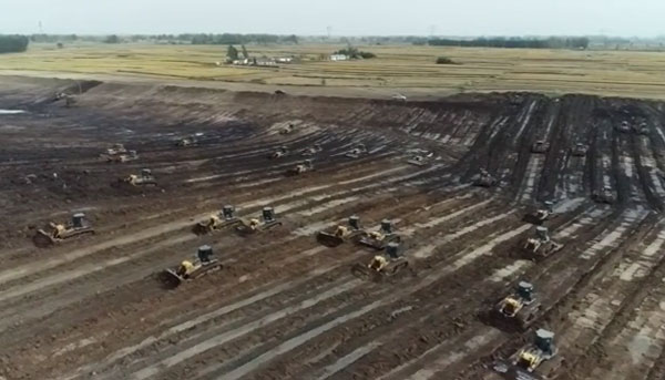 山東某河道施工工地,使用近10臺山推推土機進行土方作業。